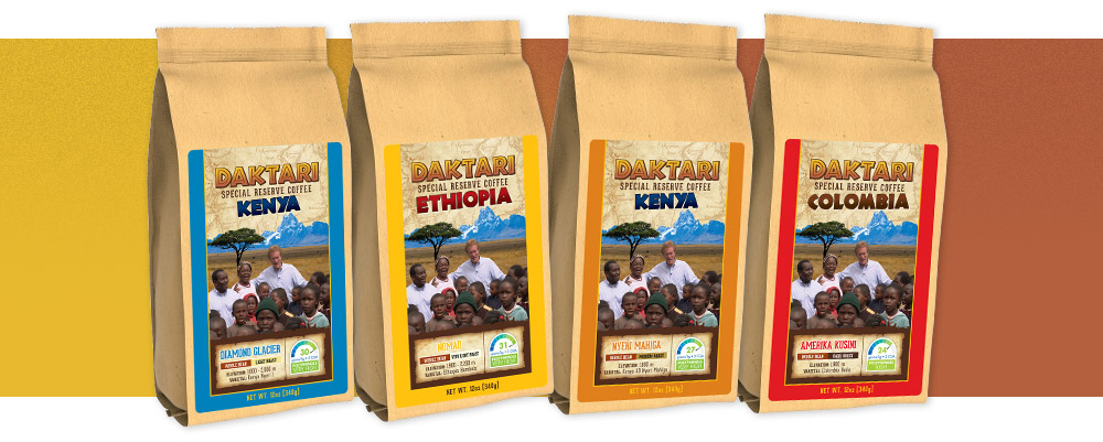 The mountain scene and landscape on the label design depicts the region of Africa where Dr. Bob Arnot, shown with African children in the foreground, has been very active. Daktari Coffee was founded by Dr. Bob Arnot, who has been involved in East Africa for over 45 years as a physician, humanitarian and journalist and has embraced coffee as a sustainable means of development.